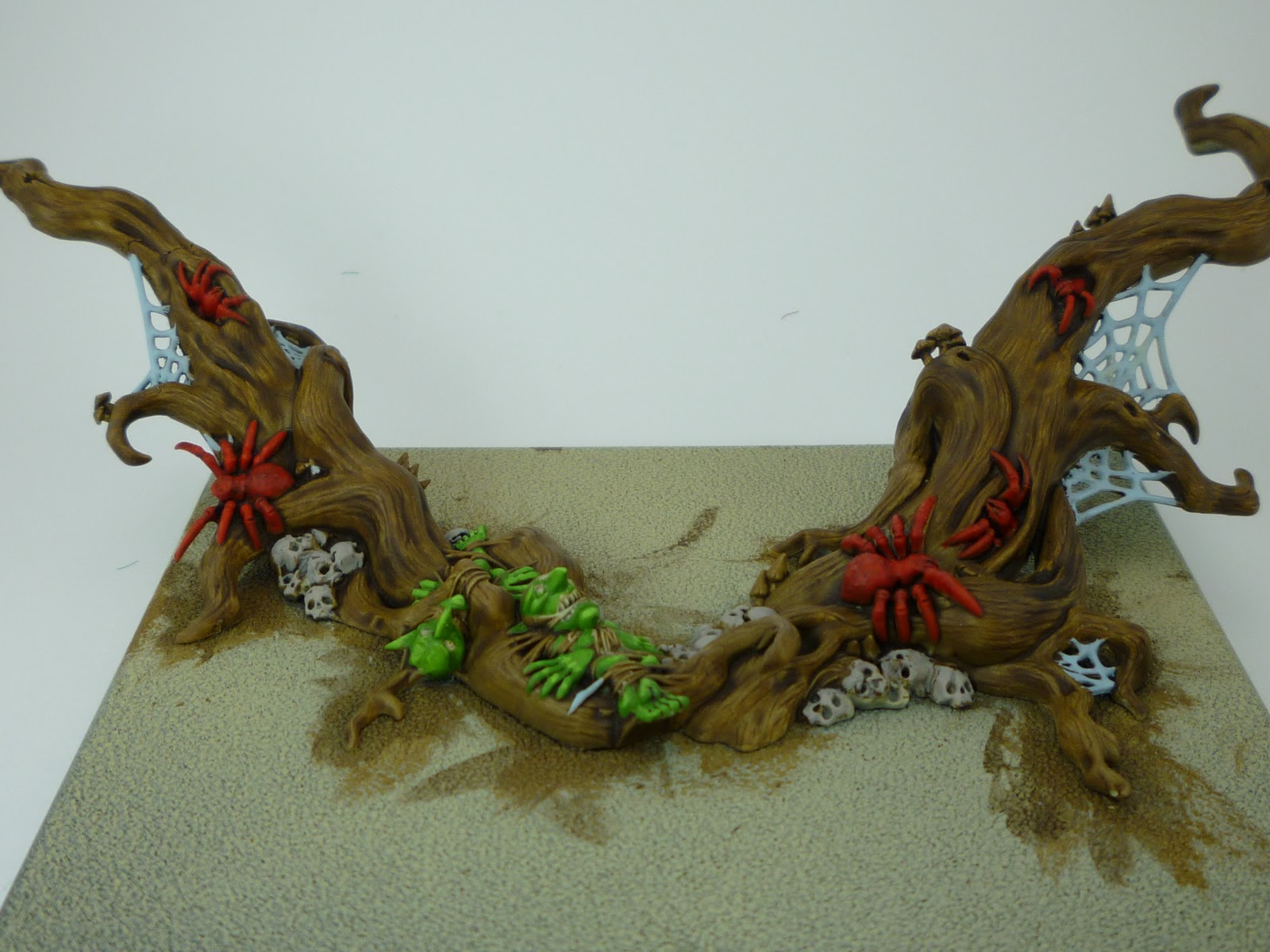 I started with a base coat of Knarloc green and a wash of brown/yellow. GW suggests that you go directly to a highlight of goblin green after the shade (they shade with Orchide Green), but instead I will be reapplying knarloc as a highlight. THEN I will apply the goblin green highlight. The last highlight will be 1:1 goblin green and Rotting flesh.